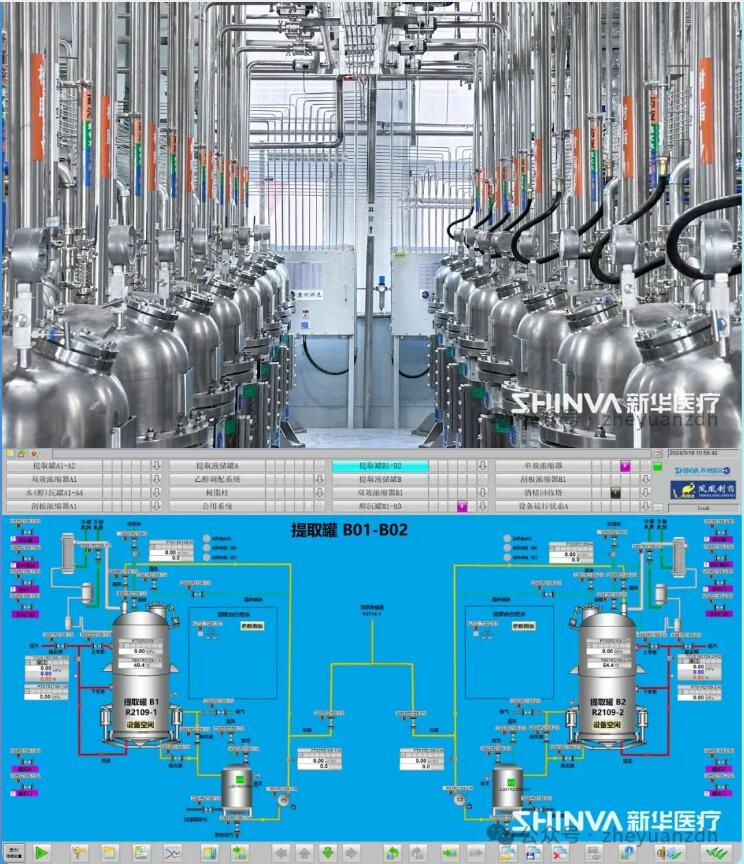 該提取車間自動化控(kòng)製係統采用先(xiān)進的西門子PCS7分散式控(kòng)製係統,此自動化控製係統共涉及自(zì)控點位3000餘個,包含27台提取罐(籃提(tí)+多功能提取),9台濃縮器、15台沉澱(diàn)罐、32台樹脂柱、3套酒精回收塔以及若幹儲罐等設備的全工段自動(dòng)化生產控製。實現(xiàn)中藥提取全流程(chéng)的自動化(huà)控製,包括多功(gōng)能(néng)提取罐的工藝多(duō)樣化,采(cǎi)用三段式加熱有(yǒu)效防止保沸和節省蒸汽能源,提高(gāo)藥材提取率;雙效濃縮器的(de)采用負壓加強製外循環的蒸發方式,蒸發(fā)溫度低能力(lì)大、濃縮速度快能滿足熱敏性物料低溫真空濃縮,實現連續自動(dòng)出膏全自動控製低溫濃縮;沉澱罐采用低溫冷凍沉降實現固液分離,精準控製加醇量和沉澱計時,減(jiǎn)少藥液的損耗、酒精精餾塔的連續補液持續蒸(zhēng)餾(liú)回(huí)收高純度(dù)酒精等功能。
